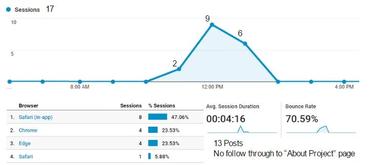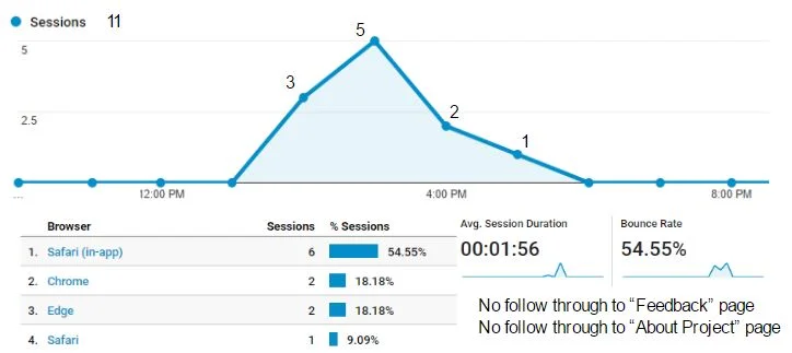 Participants lose interest once their curiosity is fulfilled - Of those that engaged with the artifact, 70% provided a response however it was clear from their responses that they did not understand the goal of the prototype. Additionally, follow through from the page in which they posted suggestions to the "About This Project" and "Read Suggestions" were extremely low. Admittedly, these findings could be a result of participants encountering the artifact for the first time whereas in a real deployment they would only interact with the prototype when they had a purpose.