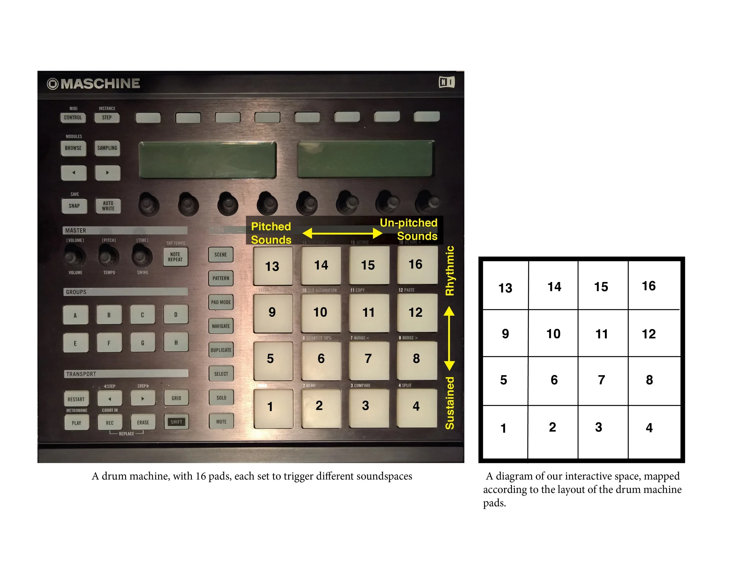 To do this we mapped 16 distinct soundscapes to the 16 pads of a drum machine – arranged in a 4 x 4 pattern. These sounds ranged from un-pitched wind noises and voice-like drones, to rhythmic beeps and pulses. We likewise designated 16 spaces within a square room. As participants moved around the room, one member would trigger the sounds on the drum machine accordingly.